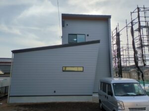 外壁のガルバリウム鋼板貼り 2026.01.29 先日完成したお家で屋根・外壁を全てガルバリウム鋼板で施工しました。 ガルバリウム鋼板のメリットは、物の軽さにあります。 瓦より圧倒的に軽い。 外壁サイディングより圧倒的に軽い。 基礎に通常使わない太さの鉄筋が随所に入っているので、 上物が軽いと、地震時に揺れが少なくなります。 見た目も個性的で、恰好が良いと思います。 ご参考になれば幸いです。